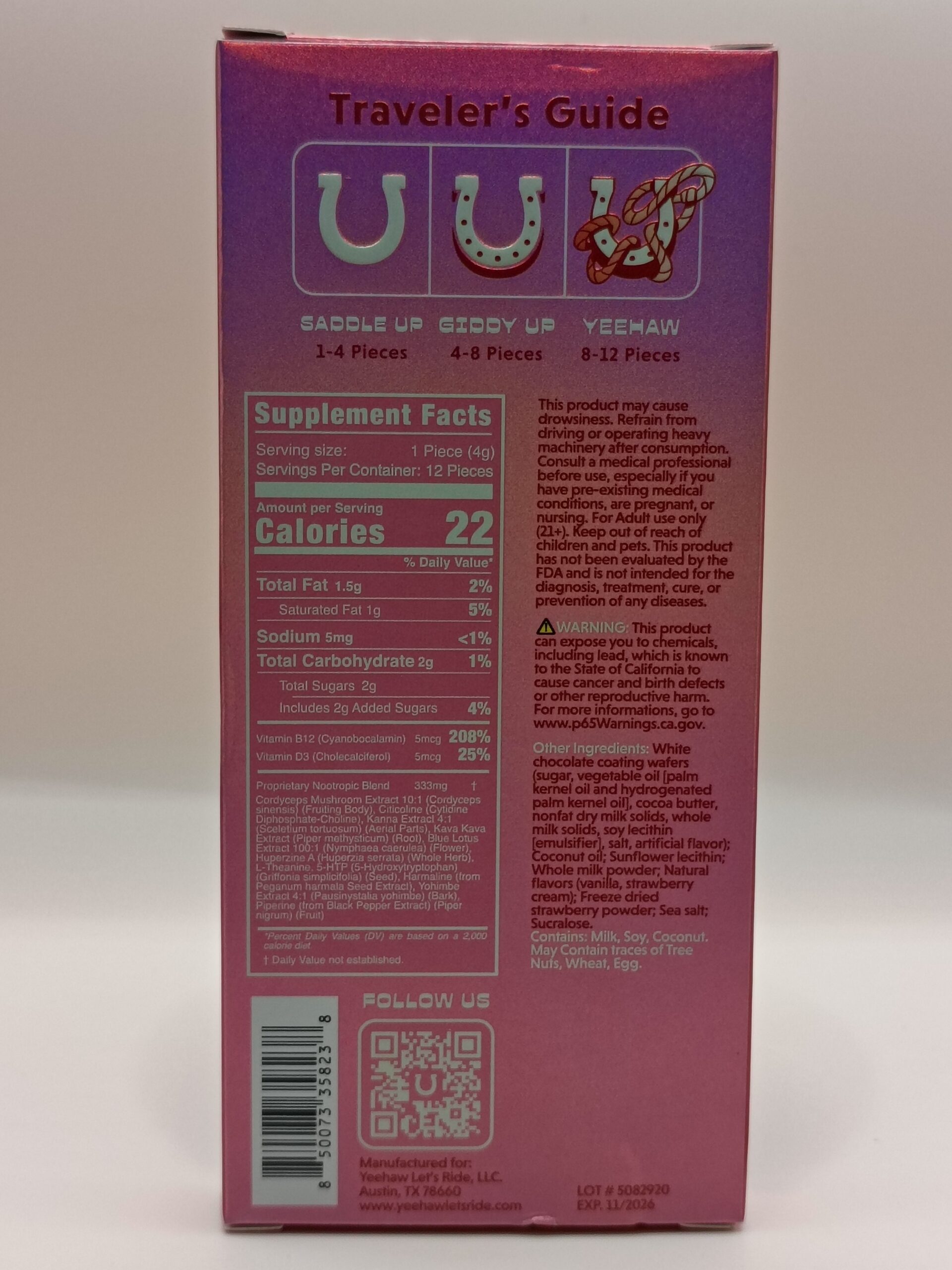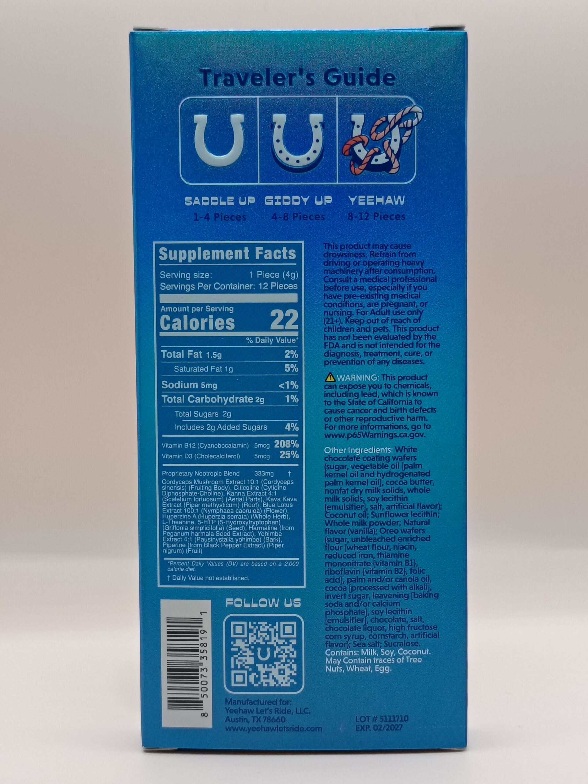 Dust off your boots and get ready to ride. YEEHAW isn’t your everyday chocolate. Each bar is powered by our proprietary magic blend, along with a next-gen formulation of cordyceps, kanna, kava, l-theanine, citicoline, theobromine, and more. Experience waves of psychedelic clarity and expanded perception. Your mood lifts, creativity flows, and your senses sharpen as you journey deeper, riding the moment as far as the horizon takes you.