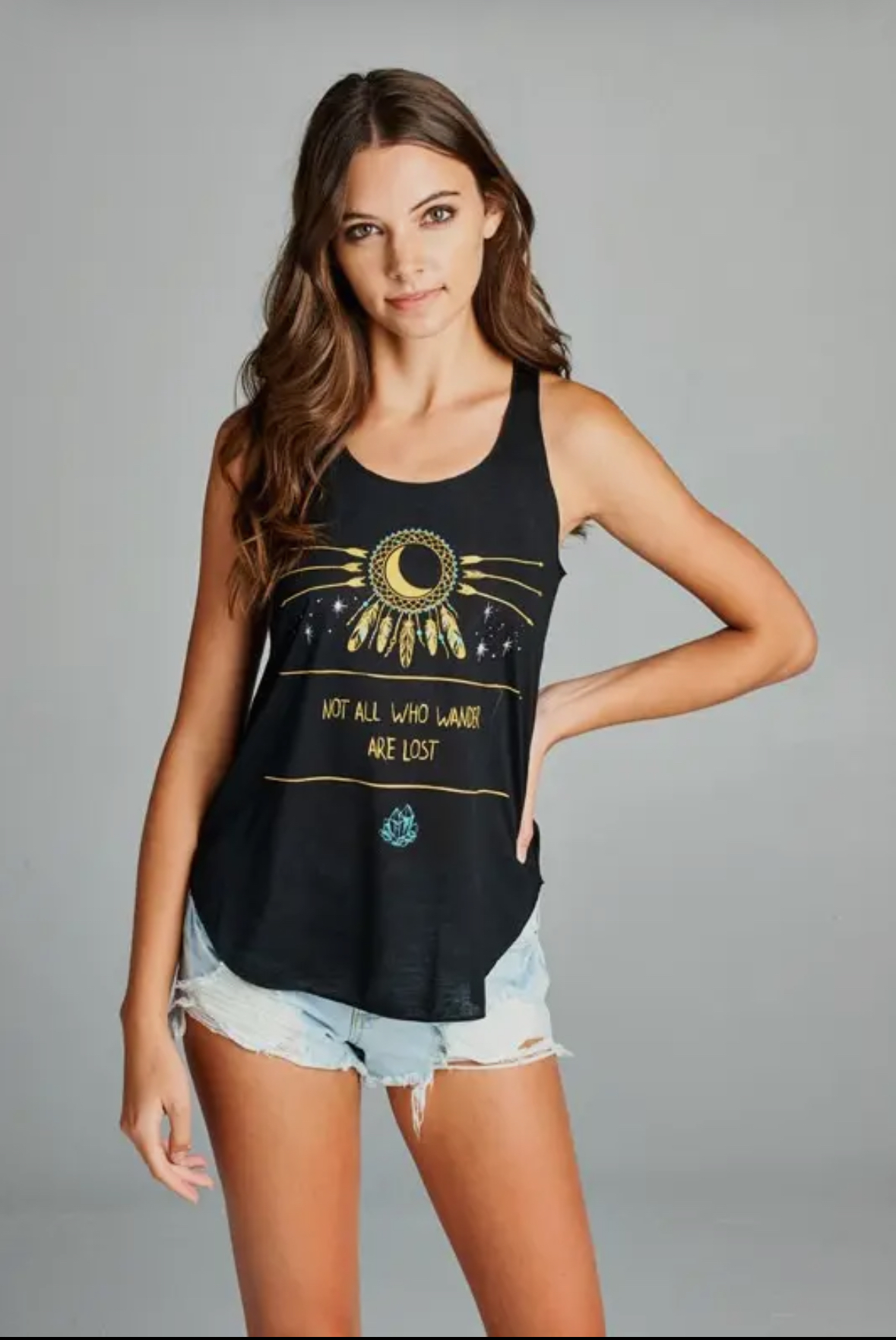 From LA Soul comes the Dream Catcher with Feather tank top, a casual yet stylish addition to your spring/summer wardrobe. Inspired by nature and vintage prints, this tank top features a thought-provoking “Not all who wander are lost” print. It’s perfect for those who appreciate a laid-back yet fashionable look. This LA Soul piece encapsulates the spirit of Los Angeles, bringing a touch of whimsy and retro charm to your everyday attire.